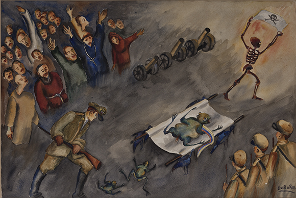 Dentro de este panorama, Débora realizó algunas obras en primeras versiones a la acuarela y segundas versiones al óleo. Esta pintura representa la naturalidad con que fue concebida: se personifica como batracio al caudillo conservador, el cual porta la banda presidencial y es llevado en camilla por aves de carroña. El cortejo lo preside un emisario de la muerte y lo cierra el general Rojas Pinilla, quien con la culata de su fusil amenaza y empuja a los seguidores de Gómez, también representados como anfibios. Al lado izquierdo una multitud y en ella dos figuras clericales: una vestida de color rojo y la otra de color azul (en representación de los partidos liberal y conservador), aplauden en plan de halago al general, lo cual puede representar el apoyo de la Iglesia en dicho suceso.