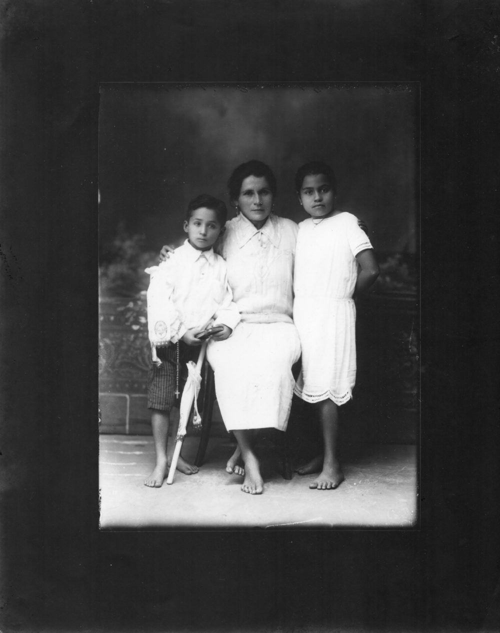 A lo largo de sus casi cuatro décadas de trayectoria, Benjamín de la Calle retrató un gran número de familias, convirtiéndolas en uno de los temas recurrentes de su vasta producción. En la mayoría de estas fotografías, predomina la presencia del padre e incluso la rotulación del archivo se hacía a su nombre, lo que da cuenta de la manera en la que se ha estructurado la sociedad antioqueña, donde la cima de la jerarquía familiar es ocupada por el varón. Sin embargo, hay en el archivo de De la Calle, como en la vida, algunos casos que rompen dicha generalidad. Aunque mayormente tradicionales, De la Calle va a retratar familias compuestas por madres o padres viudos o separados y sus hijos, abuelo y nietos, tías y sobrinos, parejas sin hijos, etc. En estas imágenes resalta una intención compositiva, en la que la indumentaria y la ornamentación dejan entrever la condición social de la familia. Tal es el caso de Leocadio Upegui y Familia (1914) o Mariano Hernández y señora (1916), en donde se observan arreglos florales a los pies de los retratados, ante la ausencia de calzado a la altura de la ocasión. En otros casos, el guiño simbólico está dado por la composición y la vestimenta, como en el caso de Gabriel Tamayo R. y Familia (1919), en la que un triángulo descendente conformado por los trajes blancos de los tres hijos, se aúnan a la posición simétrica de padre y madre, configurando así una especie de corazón.