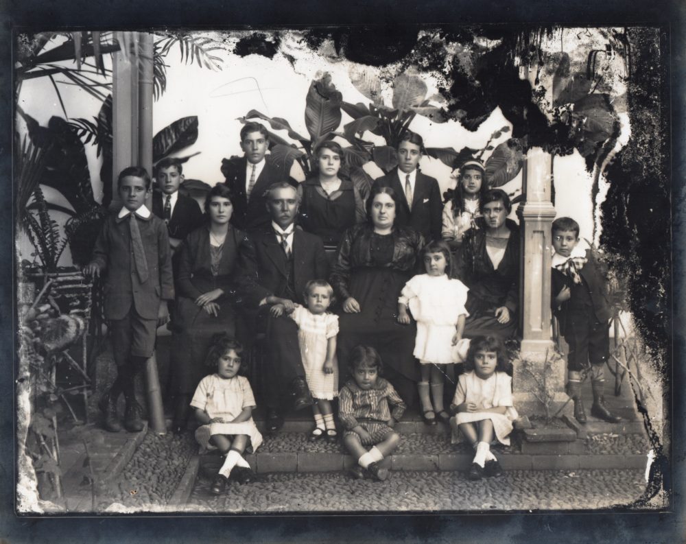 A lo largo de sus casi cuatro décadas de trayectoria, Benjamín de la Calle retrató un gran número de familias, convirtiéndolas en uno de los temas recurrentes de su vasta producción. En la mayoría de estas fotografías, predomina la presencia del padre e incluso la rotulación del archivo se hacía a su nombre, lo que da cuenta de la manera en la que se ha estructurado la sociedad antioqueña, donde la cima de la jerarquía familiar es ocupada por el varón. Sin embargo, hay en el archivo de De la Calle, como en la vida, algunos casos que rompen dicha generalidad. Aunque mayormente tradicionales, De la Calle va a retratar familias compuestas por madres o padres viudos o separados y sus hijos, abuelo y nietos, tías y sobrinos, parejas sin hijos, etc. En estas imágenes resalta una intención compositiva, en la que la indumentaria y la ornamentación dejan entrever la condición social de la familia. Tal es el caso de Leocadio Upegui y Familia (1914) o Mariano Hernández y señora (1916), en donde se observan arreglos florales a los pies de los retratados, ante la ausencia de calzado a la altura de la ocasión. En otros casos, el guiño simbólico está dado por la composición y la vestimenta, como en el caso de Gabriel Tamayo R. y Familia (1919), en la que un triángulo descendente conformado por los trajes blancos de los tres hijos, se aúnan a la posición simétrica de padre y madre, configurando así una especie de corazón.