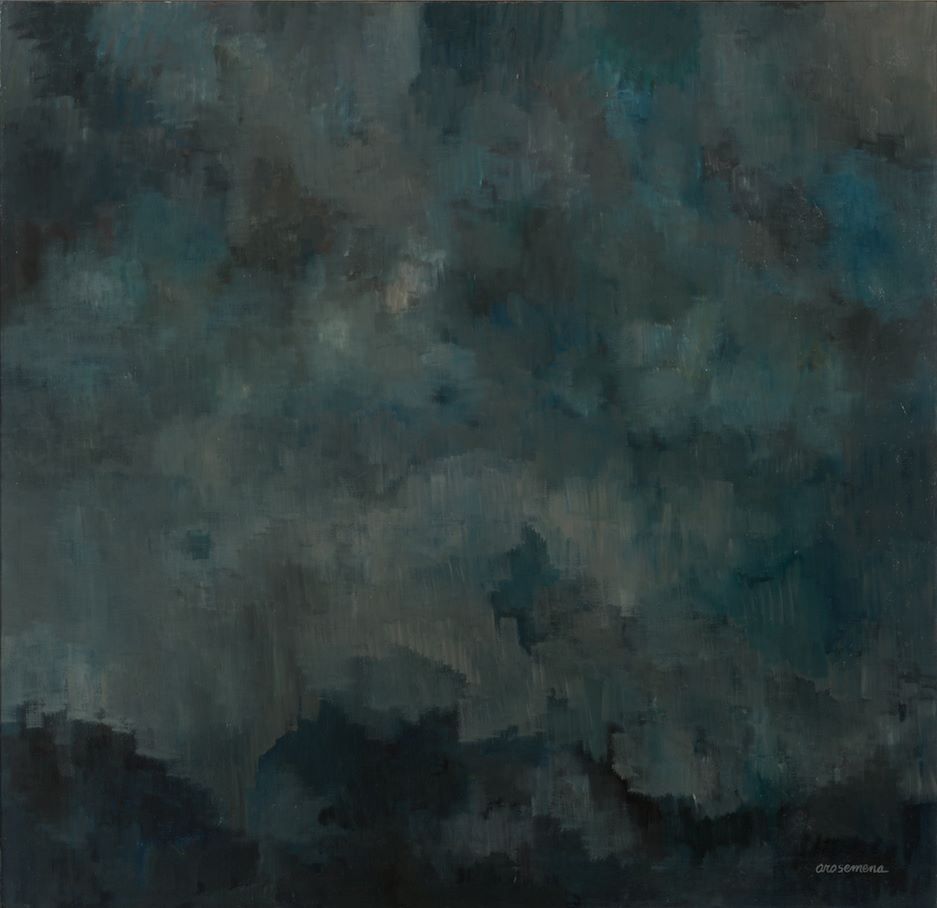 Proveniente de una notable familia panameña, Justo Arosemena Lacayo (1929-2000) llegó a Colombia en 1955 por gestión de Leonel Estrada, quien lo convocó para una exposición en la ciudad de Medellín, en donde se vinculó con artistas, intelectuales y escritores, entre ellos la poeta Olga Elena Mattei con quien se casó. Si bien su obra escultórica es ampliamente conocida por piezas como el Monumento a los obreros, Los toros, Amigos jugando, El niño elevando cometa o el polémico Cristo Desnudo, su interés por la experimentación plástica lo llevó a explorar la pintura. Aunque colaboró en la elaboración del fresco La liberación de los esclavos (1937) de Ignacio Gómez Jaramillo, su búsqueda personal lo condujo hacia un lenguaje visual más abstracto y experimental, alejado de la figuración alegórica, e interesado por la experimentación de la imagen y por la exploración misma del oficio pictórico. Debido a su cercanía con las vanguardias europeas y con el expresionismo norteamericano, gracias a sus estancias en Madrid, Canadá y EE. UU., se hizo notorio un desprendimiento de la figuración académica. Atmósfera (1970) es un claro ejemplo de ello. En dicha pieza la figuración está del todo ausente, predominan la textura y un juego monocromático que contribuye a crear un espacio cerrado, envolvente, un ambiente denso, casi táctil. Al igual que otras de sus pinturas Atmosfera no alude a la forma de lo que se representa sino que busca plasmar un estado del objeto que va más allá de lo aparente.