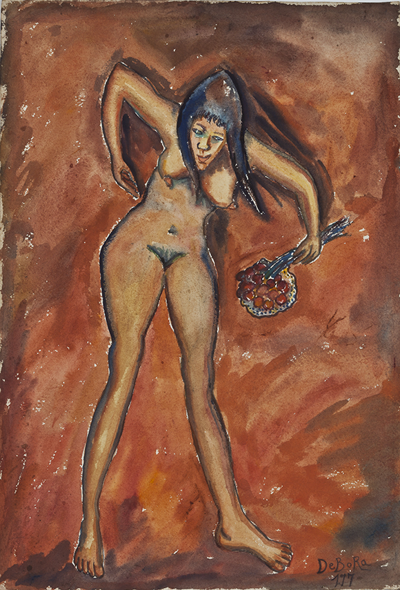 Presentadas aquí como un conjunto de piezas que dialogan estrechamente entre sí, este grupo de acuarelas pintadas de manera independiente a finales de los años setenta, nos despliega una visión particular del cuerpo femenino en diversos estados. De unos trazos rápidos y desenfadados, fuertes, sinuosos y angulosos, característicos del lenguaje expresionista, surgen en primer plano contorsionadas mujeres anónimas y flotantes en el espacio pictórico, el cual deja ver como fondo solo una brumosa mezcla cromática, enfatizando aún más las delgadas, extravagantes y solitarias siluetas. Amante de los grandes formatos y virtuosa en el uso de la acuarela, la artista nos concentra aquí ante unas poderosas y elocuentes imágenes de mediano formato, en las que los cuerpos parecen estar siempre al límite entre el goce y la marginalidad.