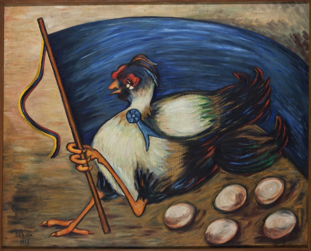 En esta obra es plasmada como una gallina, en sentido irónico y paródico, ya que esta ave, con valores no siempre positivos, se la asimila con lo timorato. Esta asociación puede reconsiderarse ya que estas aves terrestres y malas voladoras plantean otros valores pues desconfían de aquellas situaciones que se pueden considerar peligrosas o extrañas. Esta ambivalencia permea la mirada que tuvo Arango sobre esta aguerrida primera dama: como símbolos relevantes dentro la composición, la gallinácea cuida cinco huevos (Hernández tuvo cinco hijos) y lleva una bandera de color azul (símbolo del partido conservador) en la cual aparece disminuida una pequeña bandera de Colombia, en forma de cinta o de adorno, y que cuelga del mástil donde ondea el otro voluminoso emblema. Arriba en el pecho del ave hay una condecoración que puede hacer referencia al galardón que recibió por parte del partido conservador por haber permanecido en el palacio presidencial, con revolver al cinto, cuando siendo primera dama en 1948 se desató el Bogotazo.