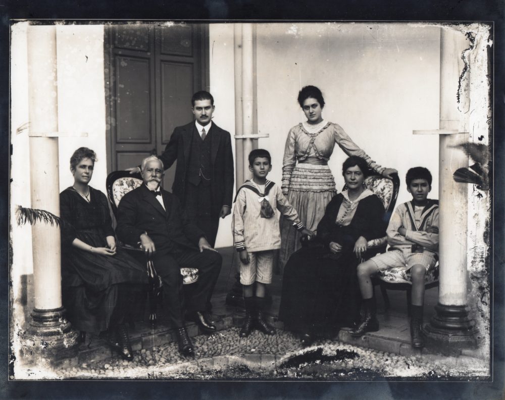 A lo largo de sus casi cuatro décadas de trayectoria, Benjamín de la Calle retrató un gran número de familias, convirtiéndolas en uno de los temas recurrentes de su vasta producción. En la mayoría de estas fotografías, predomina la presencia del padre e incluso la rotulación del archivo se hacía a su nombre, lo que da cuenta de la manera en la que se ha estructurado la sociedad antioqueña, donde la cima de la jerarquía familiar es ocupada por el varón. Sin embargo, hay en el archivo de De la Calle, como en la vida, algunos casos que rompen dicha generalidad. Aunque mayormente tradicionales, De la Calle va a retratar familias compuestas por madres o padres viudos o separados y sus hijos, abuelo y nietos, tías y sobrinos, parejas sin hijos, etc. En estas imágenes resalta una intención compositiva, en la que la indumentaria y la ornamentación dejan entrever la condición social de la familia. Tal es el caso de Leocadio Upegui y Familia (1914) o Mariano Hernández y señora (1916), en donde se observan arreglos florales a los pies de los retratados, ante la ausencia de calzado a la altura de la ocasión. En otros casos, el guiño simbólico está dado por la composición y la vestimenta, como en el caso de Gabriel Tamayo R. y Familia (1919), en la que un triángulo descendente conformado por los trajes blancos de los tres hijos, se aúnan a la posición simétrica de padre y madre, configurando así una especie de corazón.