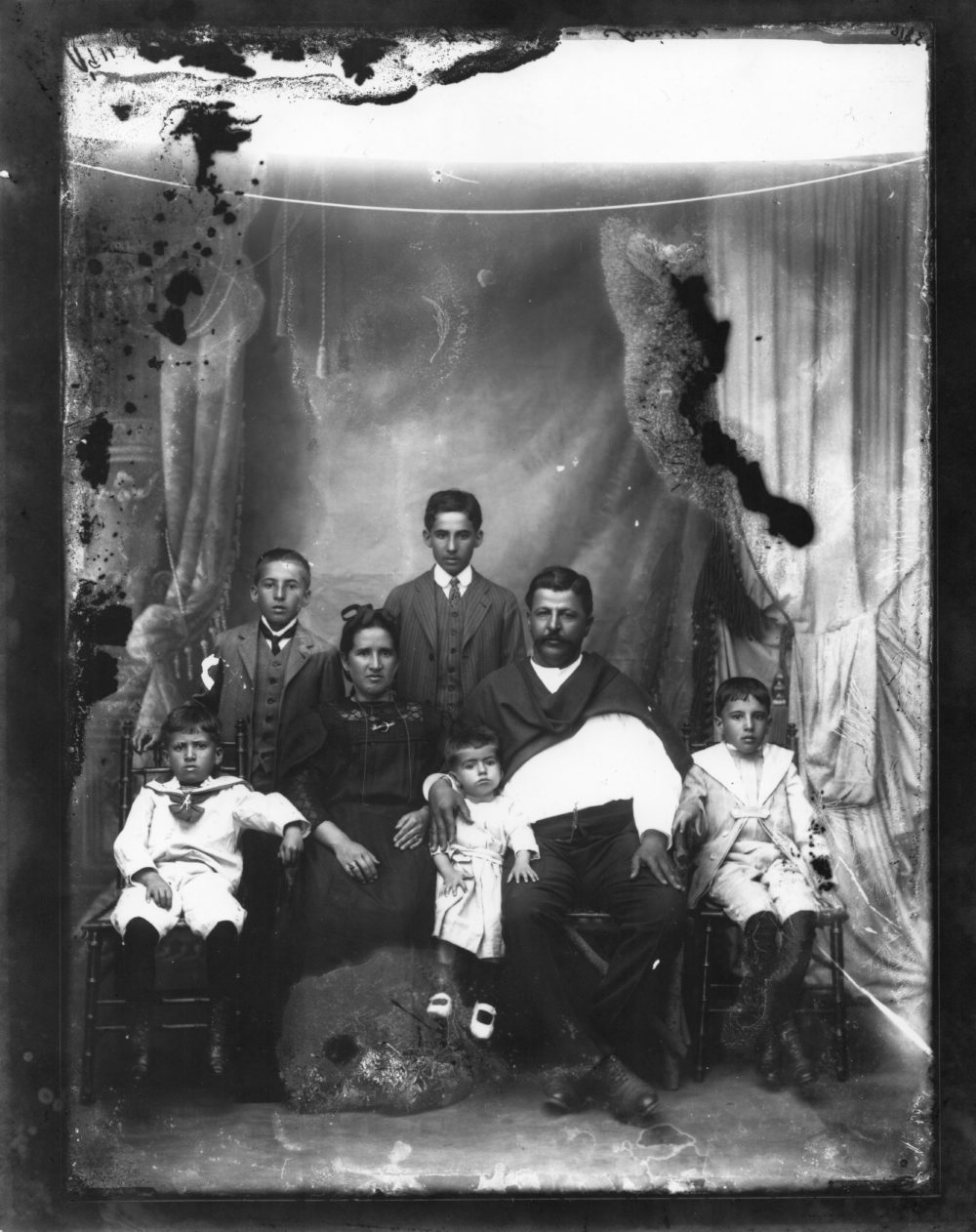 A lo largo de sus casi cuatro décadas de trayectoria, Benjamín de la Calle retrató un gran número de familias, convirtiéndolas en uno de los temas recurrentes de su vasta producción. En la mayoría de estas fotografías, predomina la presencia del padre e incluso la rotulación del archivo se hacía a su nombre, lo que da cuenta de la manera en la que se ha estructurado la sociedad antioqueña, donde la cima de la jerarquía familiar es ocupada por el varón. Sin embargo, hay en el archivo de De la Calle, como en la vida, algunos casos que rompen dicha generalidad. Aunque mayormente tradicionales, De la Calle va a retratar familias compuestas por madres o padres viudos o separados y sus hijos, abuelo y nietos, tías y sobrinos, parejas sin hijos, etc. En estas imágenes resalta una intención compositiva, en la que la indumentaria y la ornamentación dejan entrever la condición social de la familia. Tal es el caso de Leocadio Upegui y Familia (1914) o Mariano Hernández y señora (1916), en donde se observan arreglos florales a los pies de los retratados, ante la ausencia de calzado a la altura de la ocasión. En otros casos, el guiño simbólico está dado por la composición y la vestimenta, como en el caso de Gabriel Tamayo R. y Familia (1919), en la que un triángulo descendente conformado por los trajes blancos de los tres hijos, se aúnan a la posición simétrica de padre y madre, configurando así una especie de corazón.