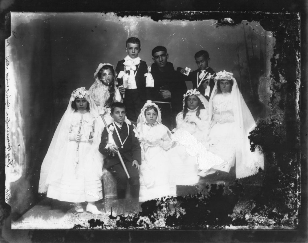 A lo largo de sus casi cuatro décadas de trayectoria, Benjamín de la Calle retrató un gran número de familias, convirtiéndolas en uno de los temas recurrentes de su vasta producción. En la mayoría de estas fotografías, predomina la presencia del padre e incluso la rotulación del archivo se hacía a su nombre, lo que da cuenta de la manera en la que se ha estructurado la sociedad antioqueña, donde la cima de la jerarquía familiar es ocupada por el varón. Sin embargo, hay en el archivo de De la Calle, como en la vida, algunos casos que rompen dicha generalidad. Aunque mayormente tradicionales, De la Calle va a retratar familias compuestas por madres o padres viudos o separados y sus hijos, abuelo y nietos, tías y sobrinos, parejas sin hijos, etc. En estas imágenes resalta una intención compositiva, en la que la indumentaria y la ornamentación dejan entrever la condición social de la familia. Tal es el caso de Leocadio Upegui y Familia (1914) o Mariano Hernández y señora (1916), en donde se observan arreglos florales a los pies de los retratados, ante la ausencia de calzado a la altura de la ocasión. En otros casos, el guiño simbólico está dado por la composición y la vestimenta, como en el caso de Gabriel Tamayo R. y Familia (1919), en la que un triángulo descendente conformado por los trajes blancos de los tres hijos, se aúnan a la posición simétrica de padre y madre, configurando así una especie de corazón.