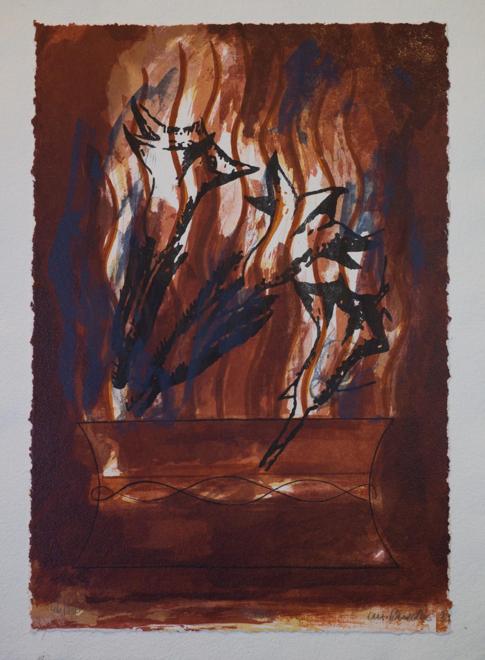 Con trece años, Ana María Rueda (1954) ya se formaba en pintura y dibujo en el taller de David Manzur. El interés por el arte, que había sido alimentado por su abuelo Plutarco, inventor de profesión, dio frutos. Con veintiséis años Rueda ya se había graduado de la Escuela Nacional Superior de Bellas Artes de París, y había recorrido múltiples museos y galerías del continente europeo. Desde entonces, la naturaleza ha sido tema, motivo y medio en el cual ha hallado inspiración, por lo que la ha convertido en el recurso principal de buena parte de su producción. Esta ha sido el faro orientador de su obra, por medio de ella se ha acercado a lo que considera “símbolos arquetípicos” del ciclo vital: agua, tierra, fuego y aire, elementos que ha explorado para establecer a través de ellos metáforas del habitar humano, pero también para invitar al espectador a reflexionar sobre su rol en la sociedad y el mundo. Agua y tierra fueron los primeros, posteriormente llegaría Fuego (1993), que funge como una suerte de pieza inaugural de esa exploración. Si bien esta serigrafía ya deja ver el viraje de Rueda hacia una abstracción marcada por lo simbólico y lo indexical, sería solo el principio de una serie que recibe el mismo nombre y que haría uso de madera pirograbada como medio. En ella acude al azar, pero también al paso del acontecimiento y la presencia del rastro de dicho suceso como ejercicio estético y producto artístico.
