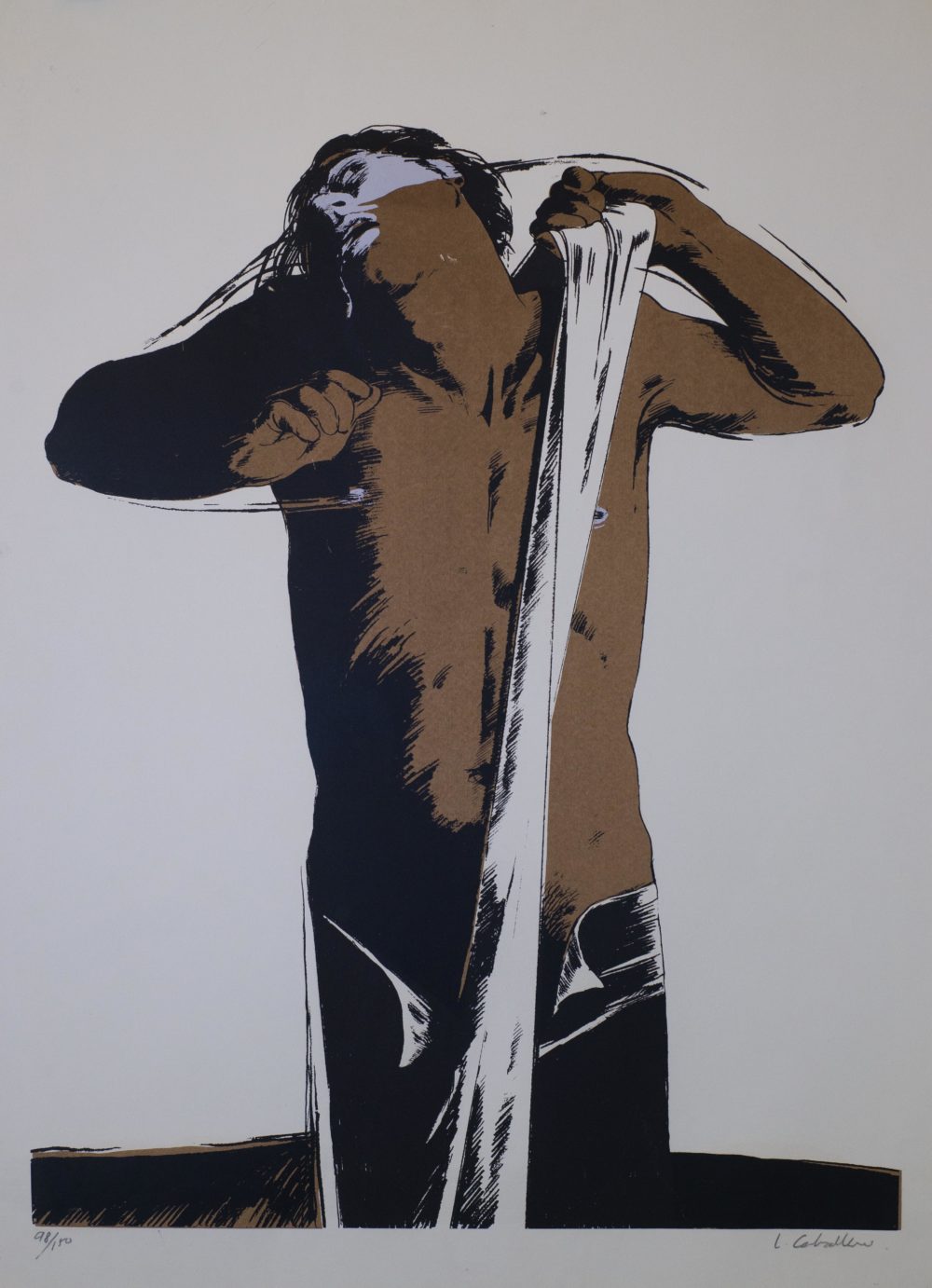 Luis Caballero (1943) fue criado en una familia bogotana vinculada a una larga línea de expresidentes, escritores, diplomáticos y militares. Sin embargo, a pesar de la comodidad práctica, libraría desde temprano complejas batallas: una relación familiar tensa, una timidez casi crónica, su homosexualidad en tiempos todavía más hostiles que los que corren, y la certeza apabullante de que no lograría encontrar en su arte lo que perseguía. Antes de ser una de las figuras inexpugnables del arte colombiano, Caballero fue un adolescente solitario al que la religión atraía profundamente; entre altares y sahumerio contempló los primeros cuerpos desnudos, aquellos mártires que oscilaban entre dolor agónico y éxtasis divino, entre muerte y placer, y que serían el faro hacia el que enfilaría sus naves. Caballero se formó en la Universidad de los Andes (1961) con Juan Antonio Roda, Luciano Jaramillo y Marta Traba, para después trasladarse a París, donde conoció a Terry Guitar, pintora estadounidense con quien se casó en 1966. Para entonces, Caballero ya había consolidado la fase inicial de su estilo, influenciado por artistas como Géricault, Bacon, Allen Jones, De Kooning y de Staël. En 1968, su “cámara del Amor” fue ganadora de la Primera Bienal Iberoamericana de Pintura Coltejer. Con el tiempo, y cuando ya había hecho pública su homosexualidad, aquellas obras de tonos pop se irían transformando, la libertad, la monocromía, la línea, el contraste, la volumetría y sobre todo el erotismo masculino se irían apoderando de sus pinturas, dibujos, grabados y finalmente de su vida.
