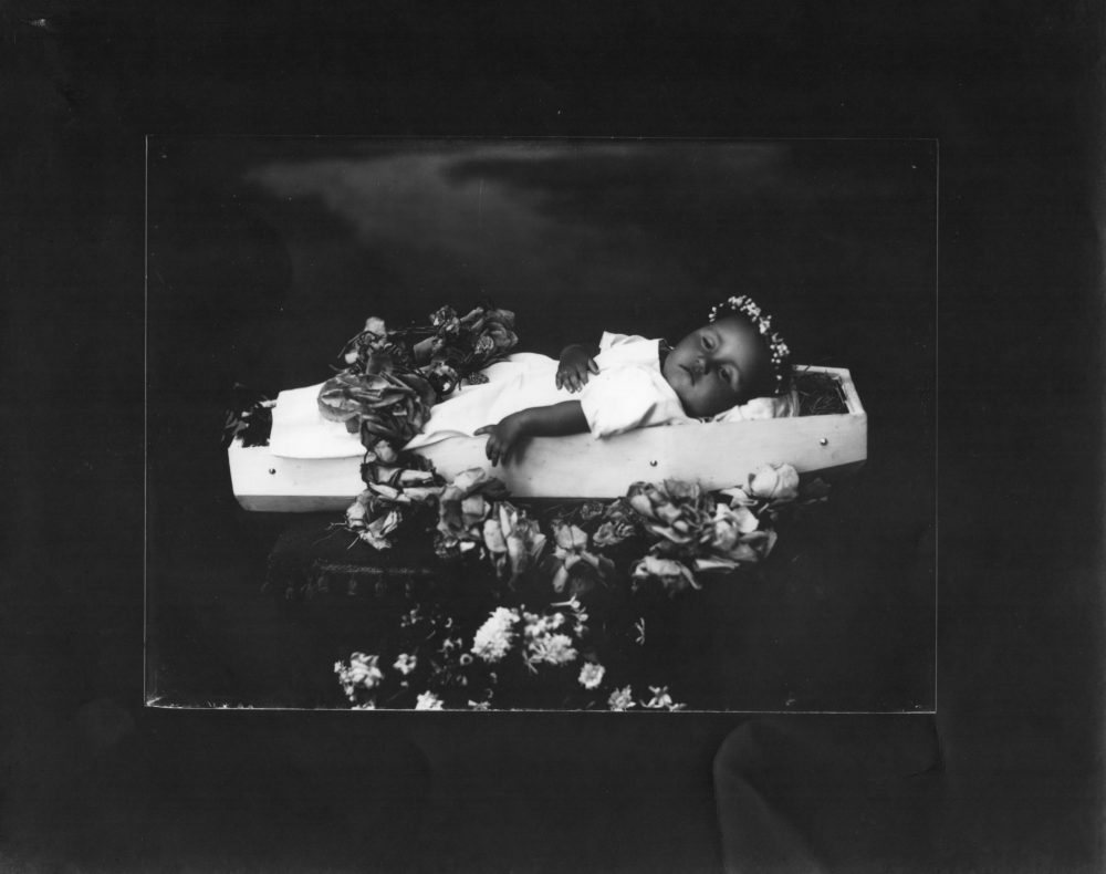 Aunque para 1920 la fotografía ya se hallaba bastante democratizada a través de los gabinetes y talleres fotográficos, su alcance era todavía limitado, pues requería personal especializado y equipos e insumos de difícil obtención. Por ello el registro fotográfico era esporádico y se empleaba mayormente en fechas y eventos relevantes, por lo que era aún menos usual fotografiar a un menor o recién nacido. Aunque los niños estaban presentes en la producción de De la Calle, existe un género en el que fueron predominantes: las fotografías postmortem. Herederas compositivas de la muerte barroca y consolidadas en la práctica francesa del último retrato (Le Dernier Portrait), estas imágenes se popularizaron en Antioquia a principios del siglo XX, en gran medida por la creencia popular de que si el menor fallecido había sido bautizado, se convertía en ángel, por lo cual pasaba a ser un intercesor divino entre Dios y la familia. En las fotografías póstumas de De la Calle predomina la composición que simula el sueño. En ella los niños reposan en un féretro diminuto que hace las veces de lecho. Su cuerpo se halla ataviado acorde a las creencias de sus padres, la mayoría de ellos católicos. La ropa y el ataúd blancos aluden a la pureza e inocencia del retratado, y el delicado tratamiento que le daba De la Calle a la toma no hace sino aumentar la solemnidad de la escena, incluso en aquellas fotografías donde los padres entre acongojados y absortos acompañan el cuerpo de su hijo.