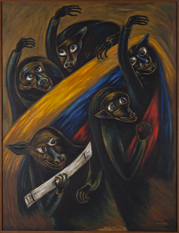 En esta pintura Arango presenta los nuevos gobernantes como cinco bestias negras envueltas por la bandera de Colombia. Una de estas figuras tiene un cartel que lleva inscritos dos signos de admiración; este elemento irónico y verbal de la artista puede estar asociado a la sorpresa y asombro con los que la pintora cuestiona la democracia y los temores que acontecían en aquella época después de la experiencia de la dictadura de Rojas Pinilla y de que el poder estuviera nuevamente en las manos de las Fuerzas Armadas.