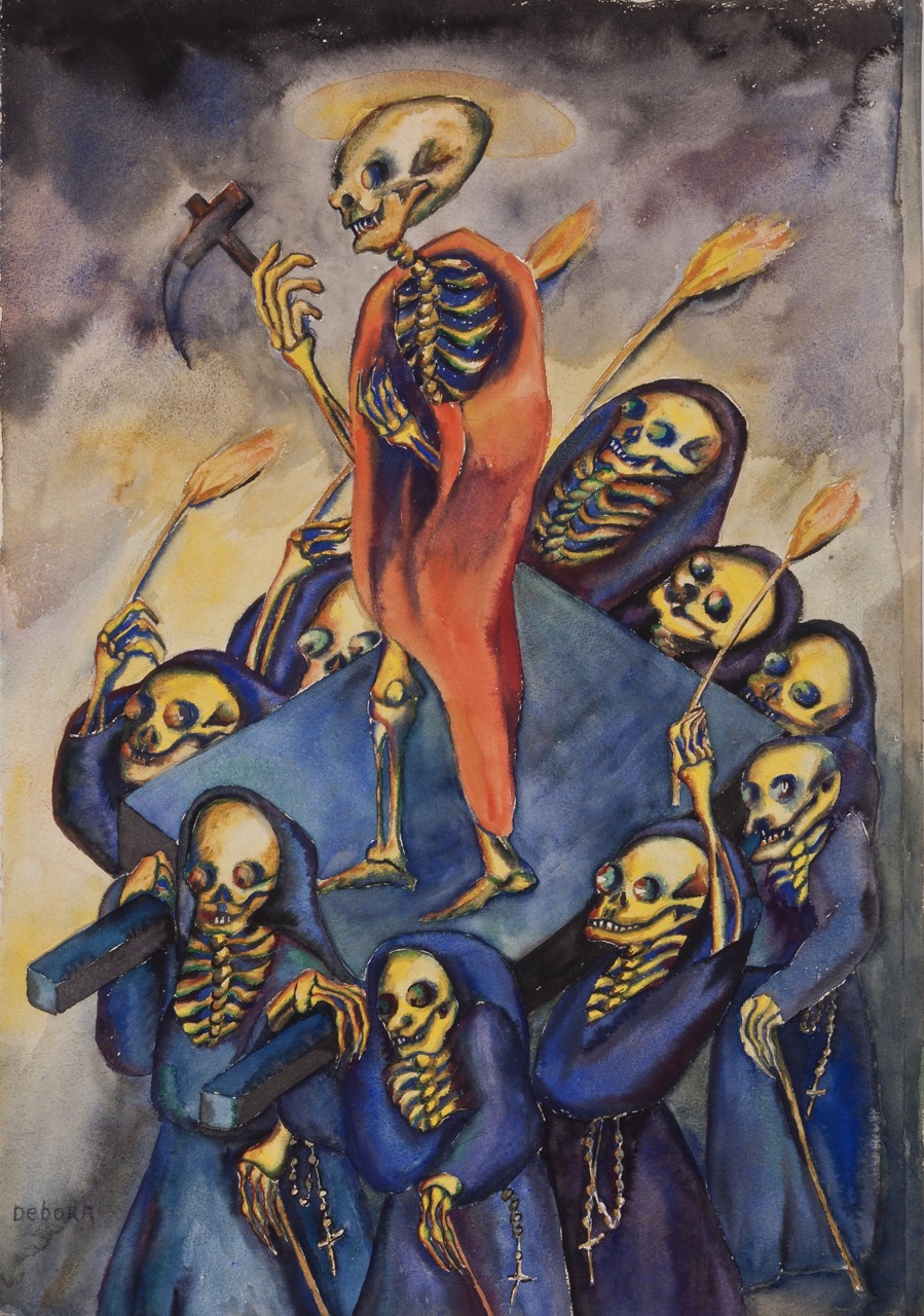 Débora Arango viajó a México en 1947 con el fin de estudiar en la Escuela Nacional de Bellas Artes, lugar donde aprendió la técnica del fresco y donde conoció el trabajo de muralistas como Orozco, Rivera y Siqueiros. Allí también conoció la propuesta artística de José Guadalupe Posada (1852-1913), grabador, ilustrador y caricaturista mexicano cuyas creaciones artísticas poseen una contundente crítica sociopolítica en las que priman las ilustraciones con calaveras. En la obra de Arango es posible encontrar correspondencias con obras de Posada.