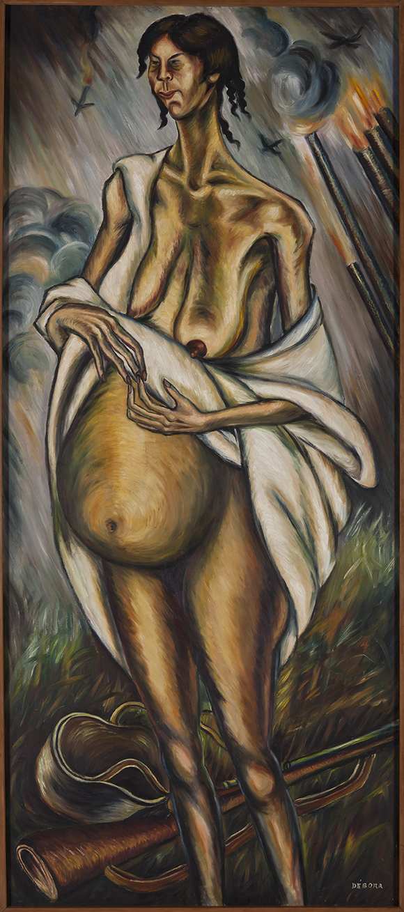 Un óleo de gran formato, donde el personaje único es una escuálida mujer embarazada y semidesnuda por la pobreza, que acuna en sus brazos a un recién nacido, mientras que en el suelo quedan un casco militar y un fusil, los otros restos materiales de la guerra. La desolación y el desamparo reinan en esta dramática imagen que no oculta la conmiseración de la artista.