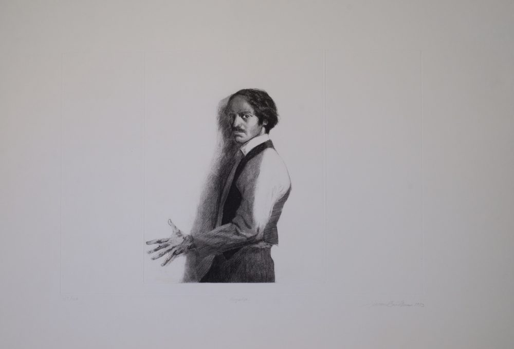Juan Cárdenas (1939), artista payanés, se formó en la Escuela de Diseño de Rhode Island y allí expuso por primera vez sus trabajos. En 1965 regresó a Colombia como caricaturista para los periódicos El Tiempo, El espacio y La República, y como profesor de dibujo y pintura en la Universidad de los Andes. Sus viñetas le traerían uno que otro problema, entre ellos el de ser encarcelado en 1966 por un “delito de lesa patria al haber profanado el Escudo Nacional” con cocaína. Aunque la asociación era sencilla y se hallaba sustentada en la relación entre la bonanza narcótica y la escena política de entonces, ni la libertad de prensa pudo salvarlo. Tras ello llegaron sus primeras exposiciones nacionales, y en 1971 fue parte de la I Bienal de Artes Gráficas del Museo La Tertulia en Cali. En 1973, cuando realizó Regalía, ya había orientado su obra hacia la exploración de la figura humana y el autorretrato, género con el que obtuvo el primer premio en pintura del XXV Salón Nacional de Artistas (1974). Sus obras logran un equilibrio entre la figuración casi onírica y la abstracción geométrica, en ellas los personajes son contemplativos, están suspendidos en una atmósfera velada por la inminencia. Él mismo mira fijamente al espectador en sus autorretratos, como si lo detallara para pintarlo y como si al mismo tiempo quisiera invertir aquella jerarquía visual que sitúa lo que es ilusorio dentro del marco, y lo que es real, fuera de él.