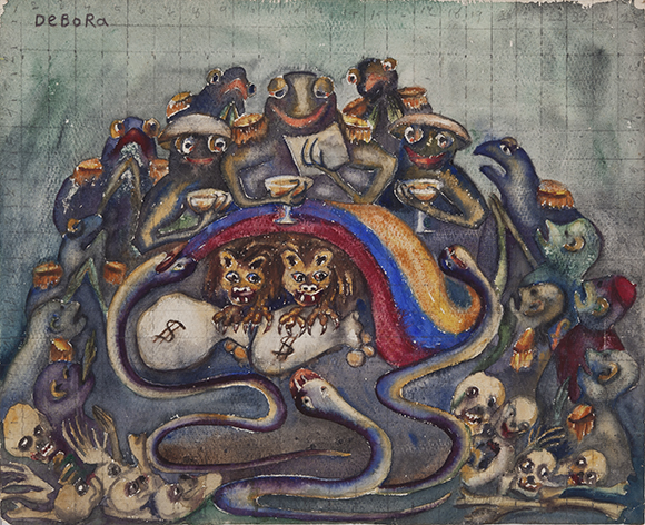 Esta pintura, cargada de elementos simbólicos, evidencia como fondo una cuadrícula numerada (de las que se usan para dibujar figuras y conservar las proporciones) sobre la cual aparece una propuesta zoomorfa con claro propósito satírico. El personaje central está caracterizado como un batracio que tiene en sus manos una copa de champaña; la figura lleva charreteras que acentúan su carácter militar. A sus lados y detrás, aparecen otros anuros, igualmente con vestimentas militares pero en postura de plegaria, elementos que profundizan la interpretación y el cuestionamiento de una situación histórica particular. La obra también materializa la idea de corrupción rampante mediante otras figuras con apariencia de animal (una tortuga, monos, serpientes) y bolsas de dinero. Hay una imagen, al lado derecho y abajo, que presenta la figura de un prelado que sugiere el apoyo de la Iglesia a dicha situación política. En el piso, regados, hay esqueletos y huesos con obvia carga metafórica.