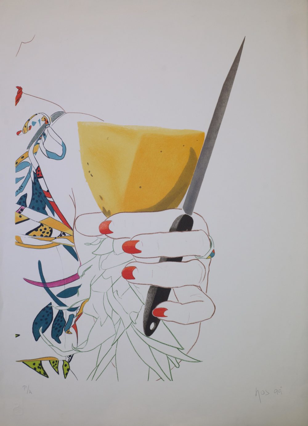 La vocación de Ana Mercedes Hoyos (1942 – 2014) se vio alimentada por su entorno familiar desde muy temprana edad. Su padre la alentó a tomar clases particulares de pintura con el prominente artista Luciano Jaramillo, quien continuó siendo su profesor cuando ingresó al programa de artes plásticas en la Universidad de los Andes; sin embargo, no llegaría a titularse ni allí ni en la Universidad Nacional. Ello no le impidió hacer una prolífica carrera que la llevó a participar en bienales internacionales y que le traería numerosos reconocimientos que la posicionaron como una figura relevante en la escena artística nacional del siglo XX. Su trabajo plástico exploró diversos horizontes, reinterpretando rasgos de movimientos artísticos como el Pop Art, la abstracción geométrica y el minimalismo. Sin embargo, sus obras son ampliamente valoradas por su capacidad para capturar la esencia del tropicalismo colombiano. Su obra exploró la riqueza cultural y étnica del país, poniendo especial énfasis en la herencia africana y el mestizaje. A partir de 1987 sus lienzos se colmaron de bodegones y palanganas de San Basilio de Palenque, en ellos Ana Mercedes Hoyos veía la manifestación de un equilibrio funcional que le rememoraba a los constructivistas rusos, pero también, la posibilidad de resaltar la herencia africana y la diversidad colombiana, abriendo así un nicho de representación que hasta entonces había sido marginado de la plástica colombiana. Así, la artista amplió una identidad visual nacional, que además busca rendir homenaje a estas comunidades y a su lucha cotidiana por la igualdad.