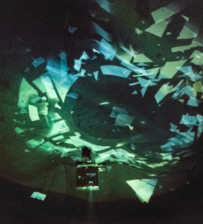 Se trata de una especie de bucle que contiene elementos de este ecosistema en su devenir natural, el cual se cimienta en la experiencia intersubjetiva con ondas que deambulan entre canales de sonido, proyectores de video, mosaicos de espejos y gotas de agua, los cuales ofrecen un refugio en la imaginación para que cada quien construya su propia selva.