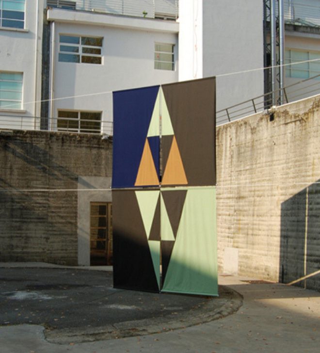 Imagen: Felipe Mujica, Untitle (El Quisco), 2013. Tela y costura, 4 paneles de 200 x 120 cm. Vista de instalación Fondaziones Merz, Turín