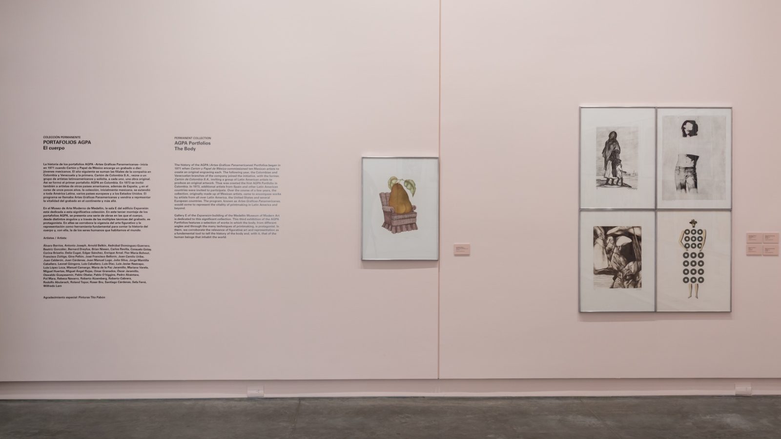 Así se formó el primer portafolio AGPA en Colombia. En 1973 se invitó también a artistas de otros países americanos, además de España, y en el curso de unos pocos años, la colección, inicialmente mexicana, se extendió a toda América Latina, varios países europeos y a los Estados Unidos. El programa se llamaba Artes Gráficas Panamericanas y vendría a representar la vitalidad del grabado en el continente y más allá. En el Museo de Arte Moderno de Medellín, la sala E del edificio Expansión está dedicada a esta significativa colección. En este tercer montaje de los portafolios AGPA, se presenta una serie de obras en las que el cuerpo, desde distintos ángulos y a través de las múltiples técnicas del grabado, es protagonista. En ellas se corrobora la vigencia del arte figurativo y la representación como herramienta fundamental para contar la historia del cuerpo y, con ella, la de los seres humanos que habitamos el mundo.