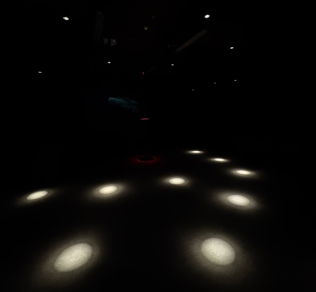 Las luminarias cenitales dispuestas en la obra evocan la manera en que las luces atraen a las especies en la penumbra y también guían a los visitantes hacia puntos de interacción en el piso; así mismo, a través de un dispositivo de proximidad y módulos interactivos ubicados en el suelo, pueden modular la intensidad, espacialidad y textura del paisaje sonoro, lo que los convierte en cocreadores de la obra. Los sonidos que se activan desde el piso provienen de instrumentos virtuales creados a partir del registro sonoro de dos especies de murciélagos: Eumops nanus y Promops centralis. Estos sonidos contrastan registros y timbres que enriquecen la diversidad y complejidad del entorno sonoro sin seguir una lógica tonal o escalar específica.