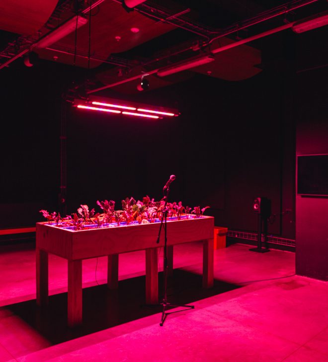 In this project, horticulture is presented as a device of joy, pleasure, resistance, and autonomy in the face of an uncertain future. Sine waves (sounds) and artificial light make of Lab 3 a space of contemplation and deep listening where the plants’ reception of sound and light converge with each other for both the vegetables and the humans. The acoustic stimulation for the beets is produced by a multichannel piece and a transducer connected to a microphone open to the public through which visitors are invited to stimulate the growth of the plants with the vibration of their voices. The installation is complemented by a processed video of the Sun.